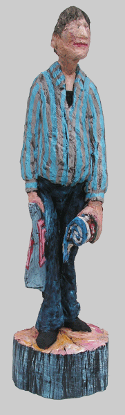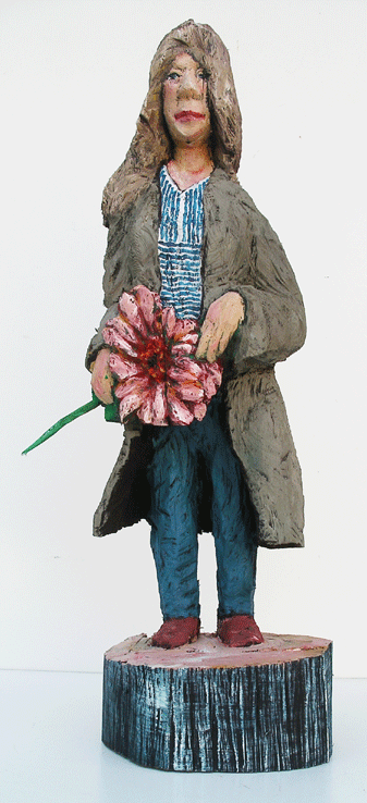 Eine Seite voller Skulpturen und die meisten aus Holz. Menschen wartend auf dem Bahnhof an Gleis 85. Die Größe bewegt sich zwischen 80 und 100 Zentimetern.