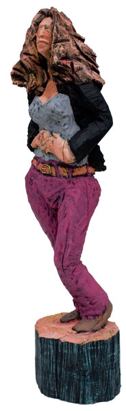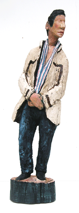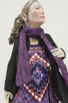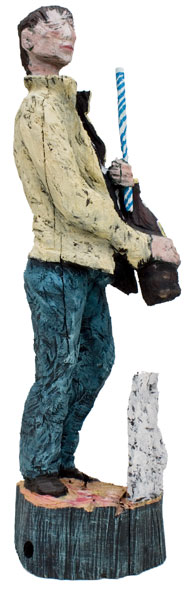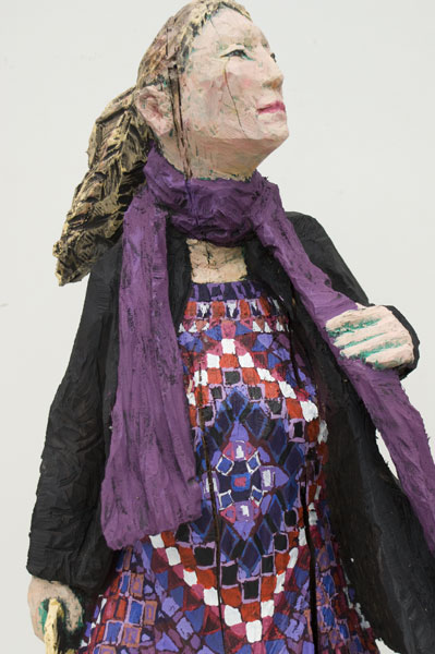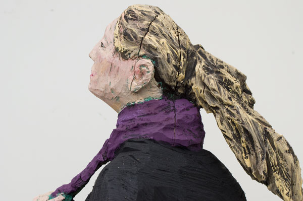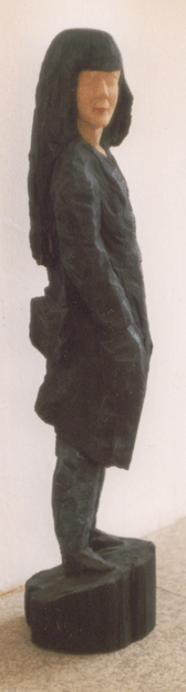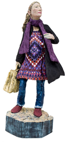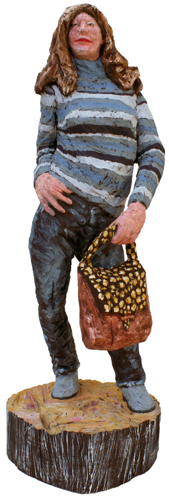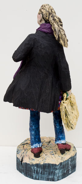 Eine Seite voller Skulpturen und die meisten aus Holz. Menschen wartend auf dem Bahnhof an Gleis 85. Die Größe bewegt sich zwischen 80 und 100 Zentimetern.