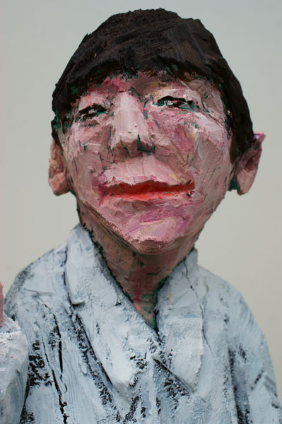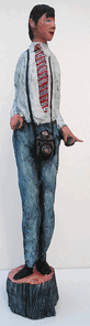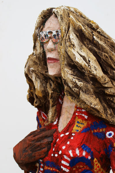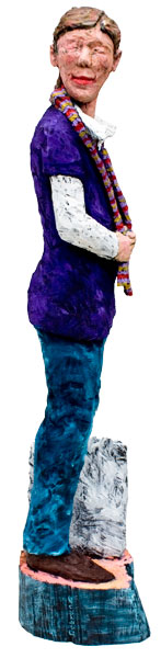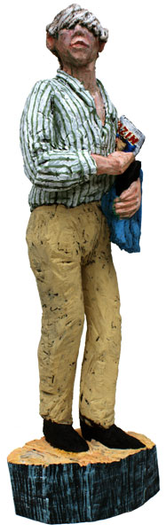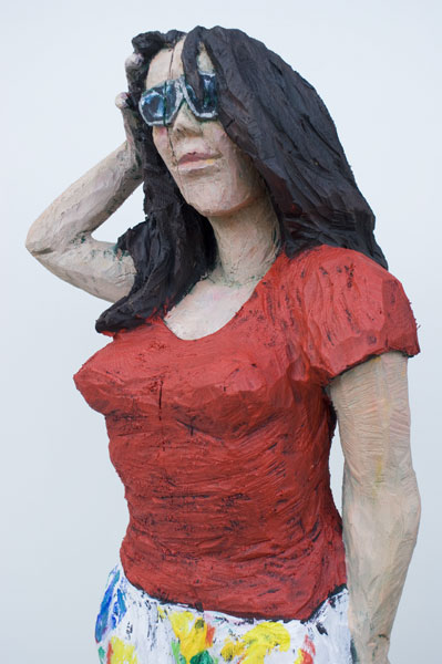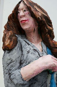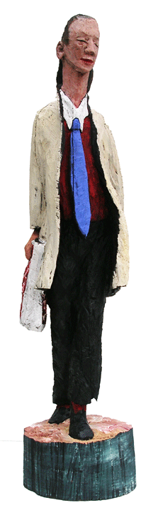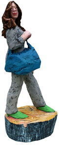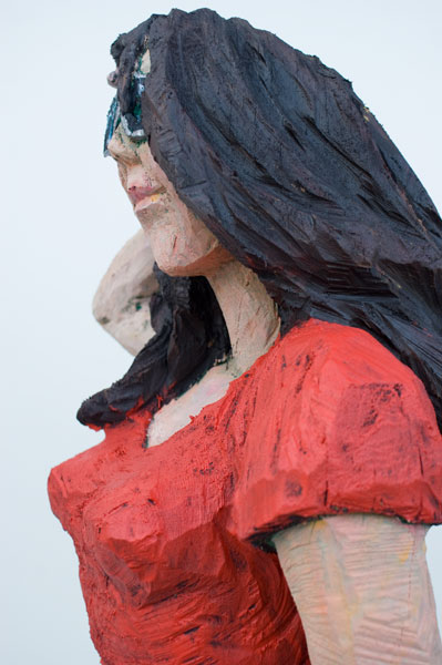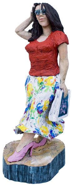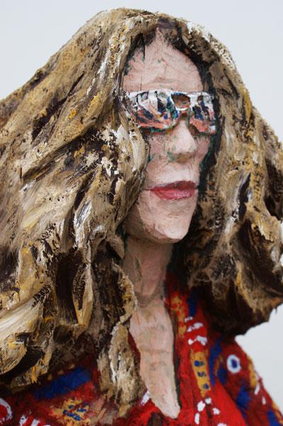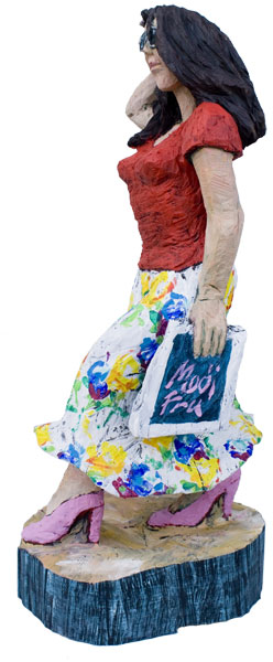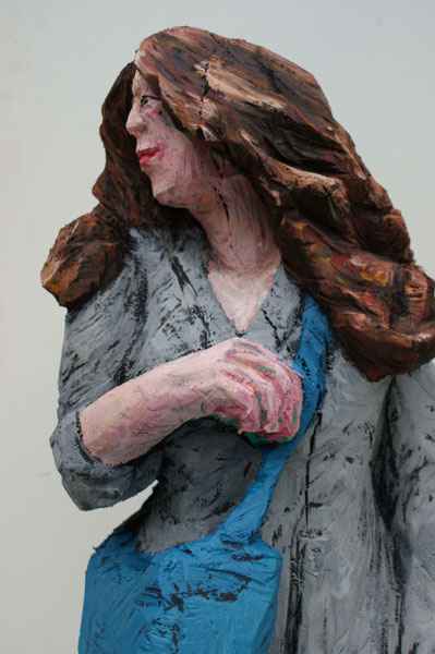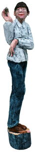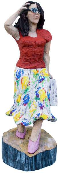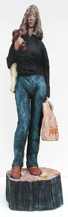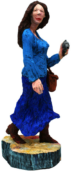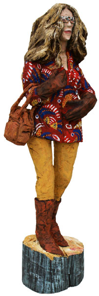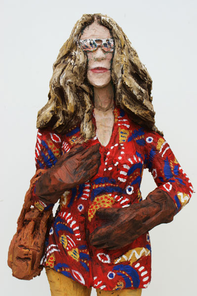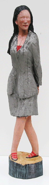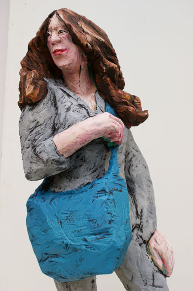 Eine Seite voller Skulpturen und die meisten aus Holz. Menschen wartend auf dem Bahnhof an Gleis 85. Die Größe bewegt sich zwischen 100 und 130 Zentimetern.
