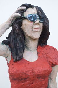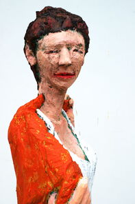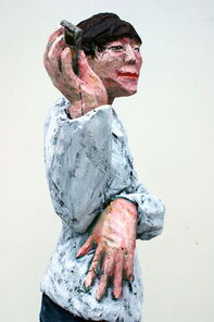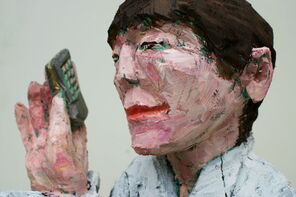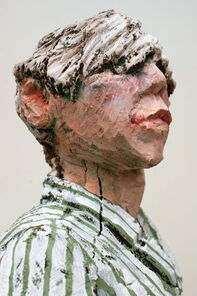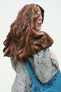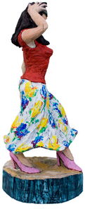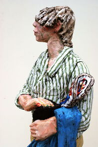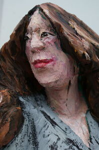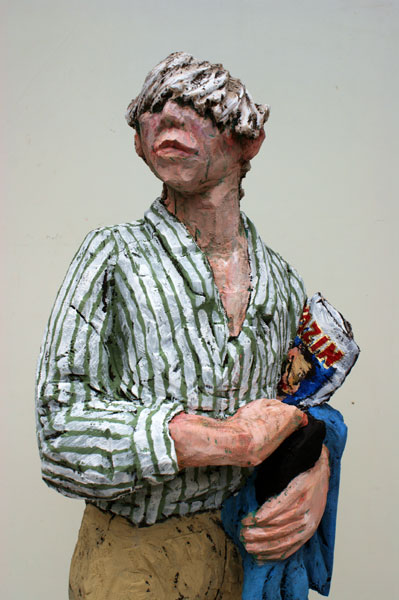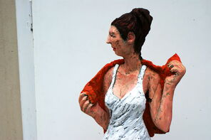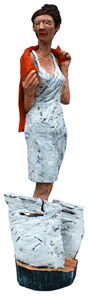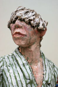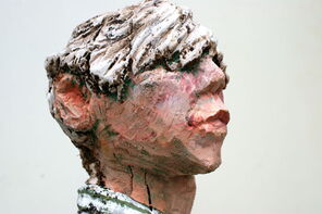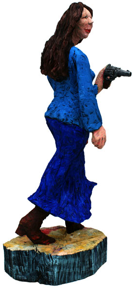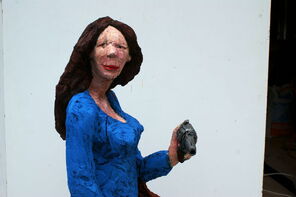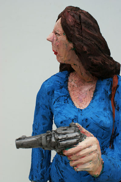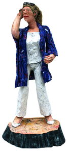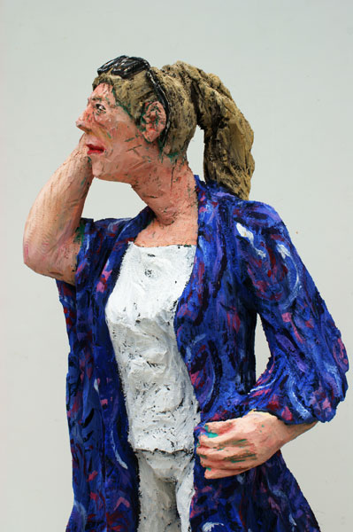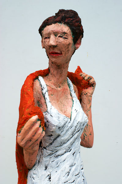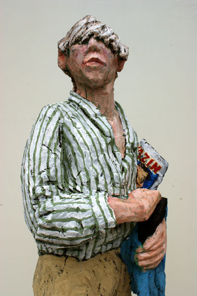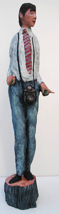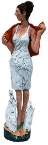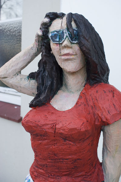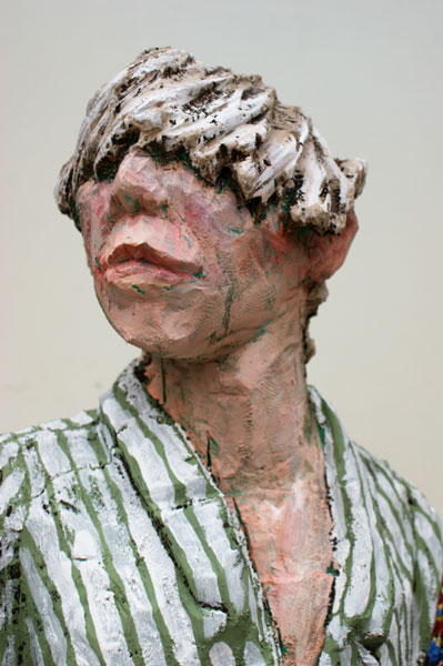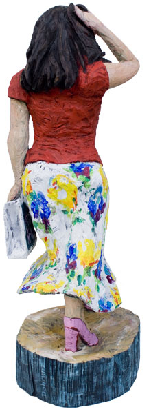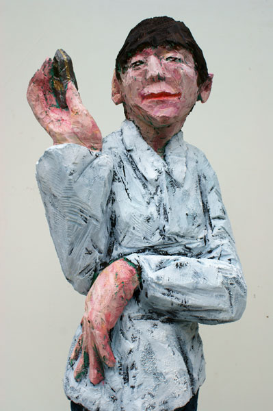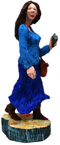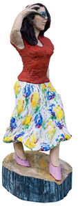 Eine Seite voller Skulpturen und die meisten aus Holz. Menschen wartend auf dem Bahnhof an Gleis 85. Die Größe bewegt sich zwischen 100 und 130 Zentimetern.