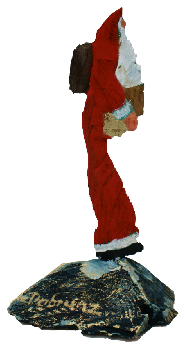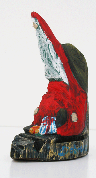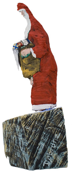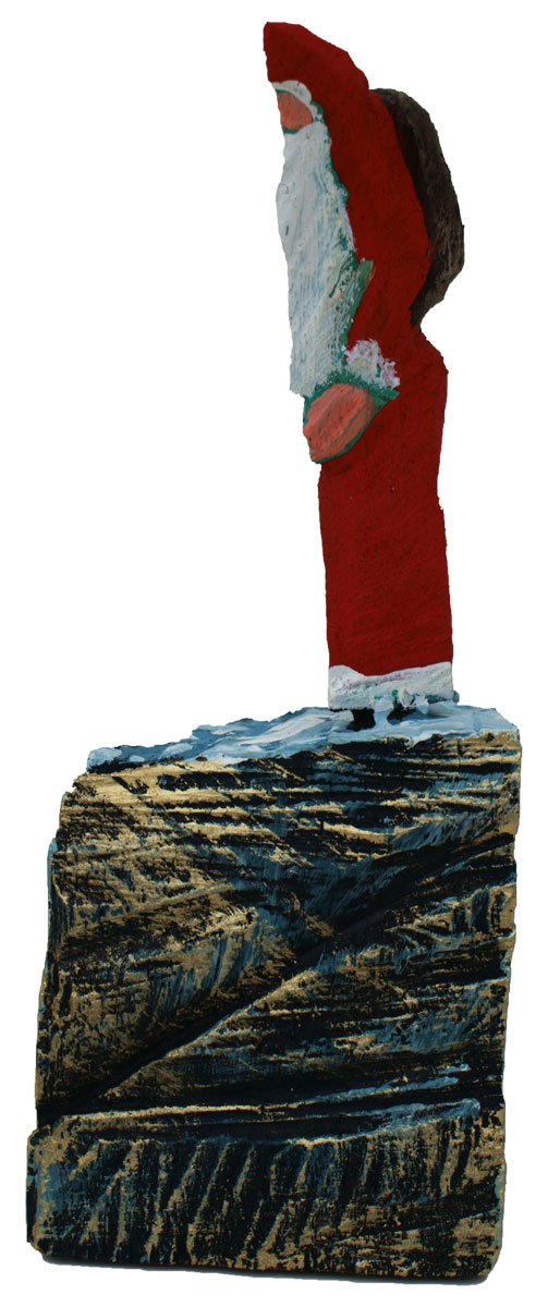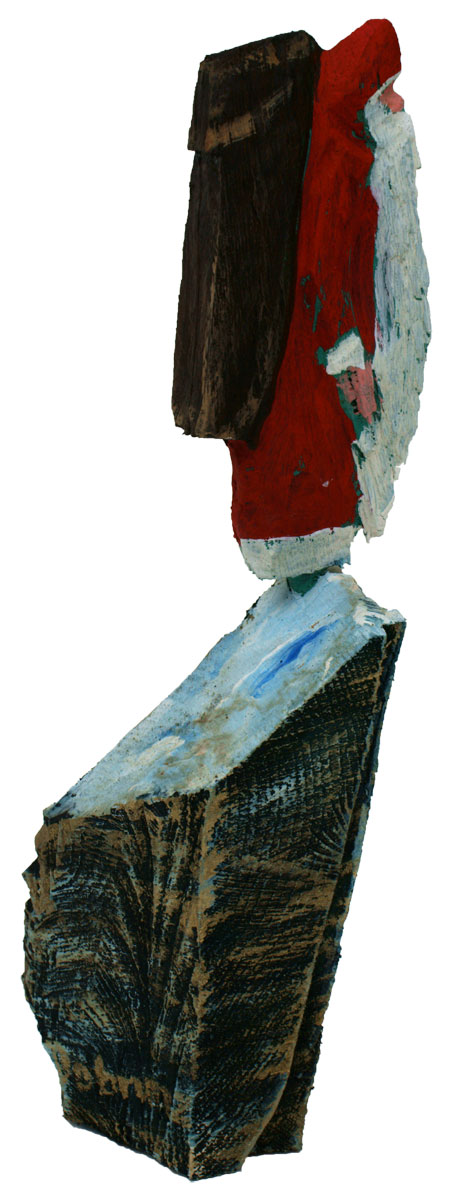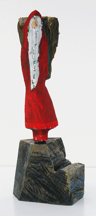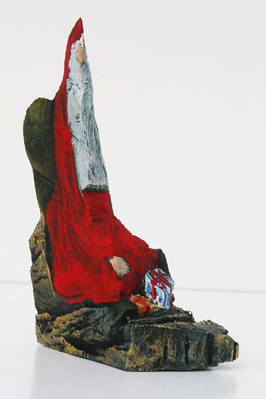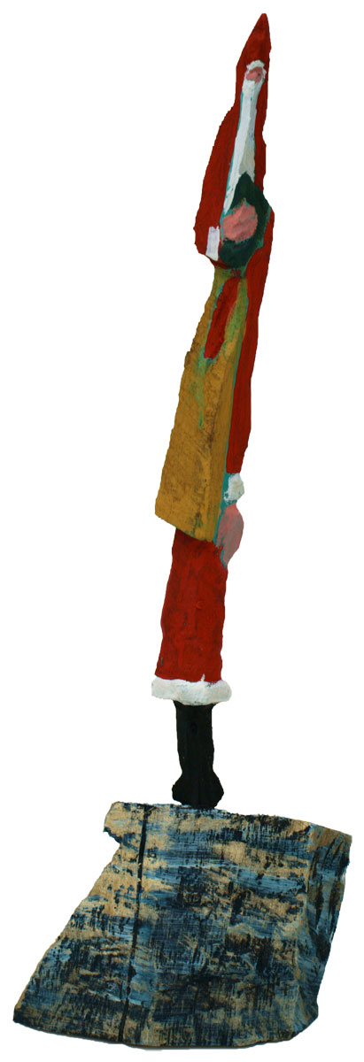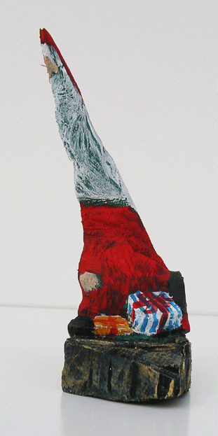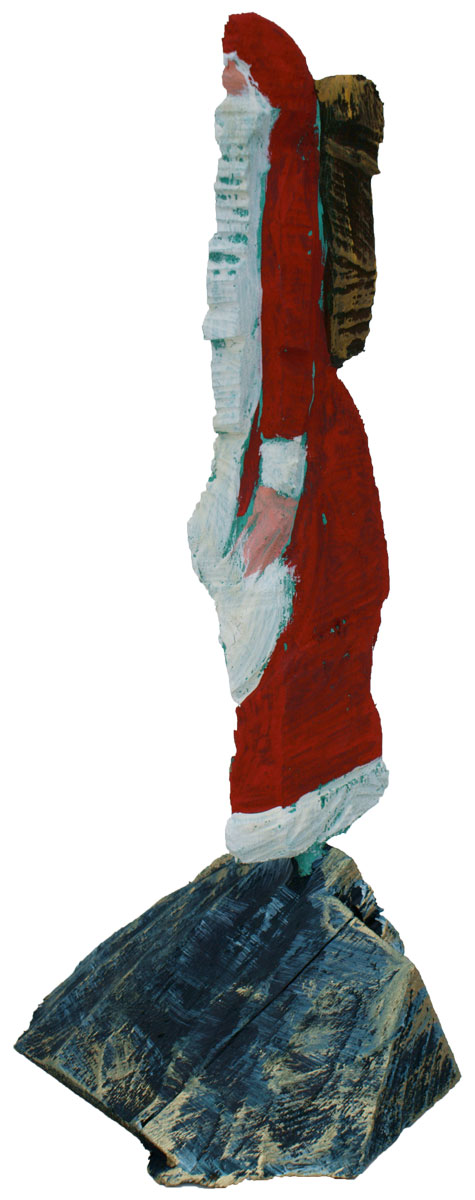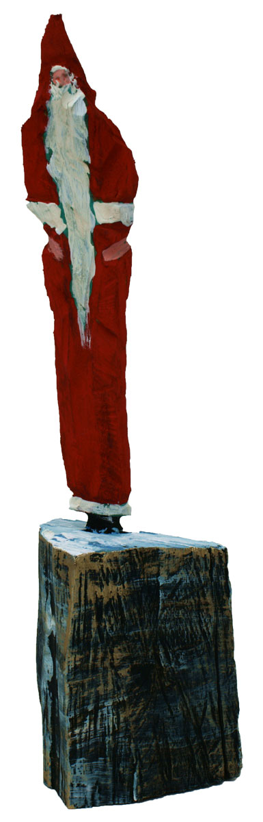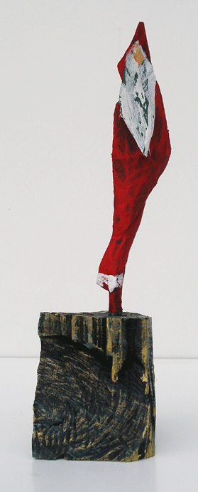 Aus den Reststücken der großen Skulpturen entstehen die Weihnachtsmänner. Sie verlieren übrigens zu keiner Jahreszeit ihre skulpturale Wirkung. Einen ähnlichen Entstehungsprozess finden Sie übrigens auch bei den Passanten, den Nachtgestalten und einigen Fußballern.